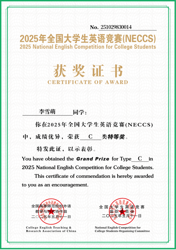 2025年5月,由高等学校大学外语教学指导委员会和高等学校大学外语教学研究会组织的2025年全国大学生英语竞赛(National English Contest for College Students,NECCS)决赛举办。我院24级木材科学与工程(中外合作办学)专业李雪萌同学在本次全国大学生英语竞赛决赛中荣获C类(非英语专业本科组)特等奖。