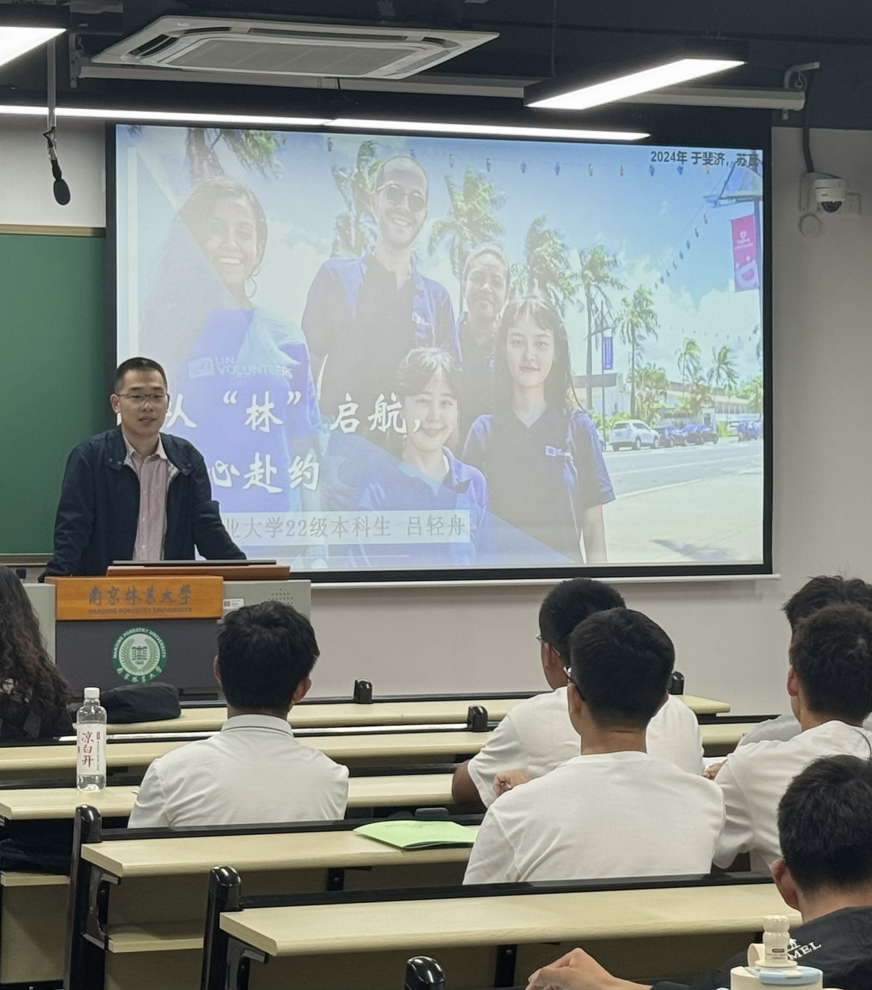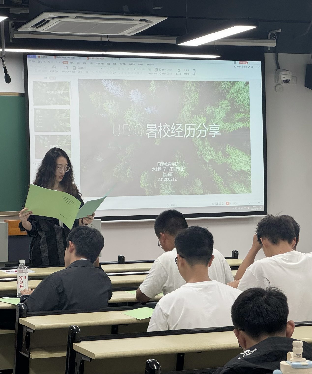 在第三项议程中,来自2023级木材科学与工程专业学生、新生副班主任徐瑾田分享了在UBC暑校项目的学习体验,从行前准备、暑校大致内容等角度为新生提供了该项目参与的收获与感悟。